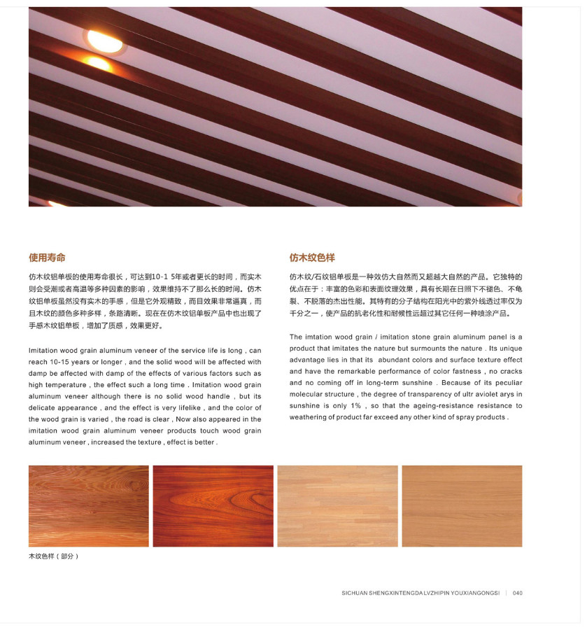 仿?紋/?紋鋁單板是?種效仿??然??超越??然的產(chǎn)品。它獨(dú)特的優(yōu)點(diǎn)在于:豐富的?彩和表?紋理效果,具有?期在?照下不褪?、不?裂、不脫落的杰出性能。其特有的分?結(jié)構(gòu)在陽(yáng)光中的紫外線透過(guò)率僅為千分之?,使產(chǎn)品的抗?化性和耐候性遠(yuǎn)超過(guò)其它任何?種噴涂品。