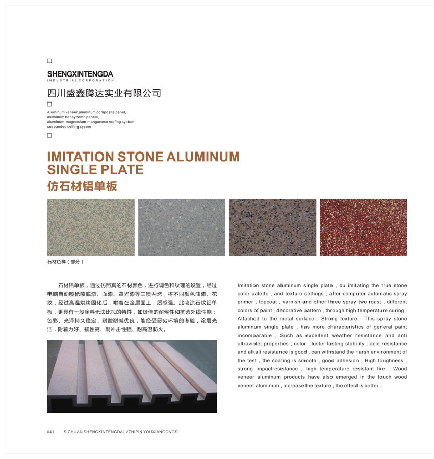 ?材鋁單板,通過仿照真的?材顏?,進?調?和紋理的設置,經(jīng)過電腦?動噴槍噴底漆、?漆、罩光漆等三噴兩烤,將不同顏?油漆、花紋,經(jīng)過?溫烘烤固化后,咐著在?屬?上,質感強。此噴涂?紋鋁單板,更具有?般涂料?法?擬的特性,如極佳的耐候性和抗紫外線性能;?彩、光澤持久穩(wěn)定,耐酸耐堿優(yōu)良,能經(jīng)受惡劣環(huán)境的考驗,涂層光潔,附著?好、韌性?、耐沖擊性強、耐?溫防?。